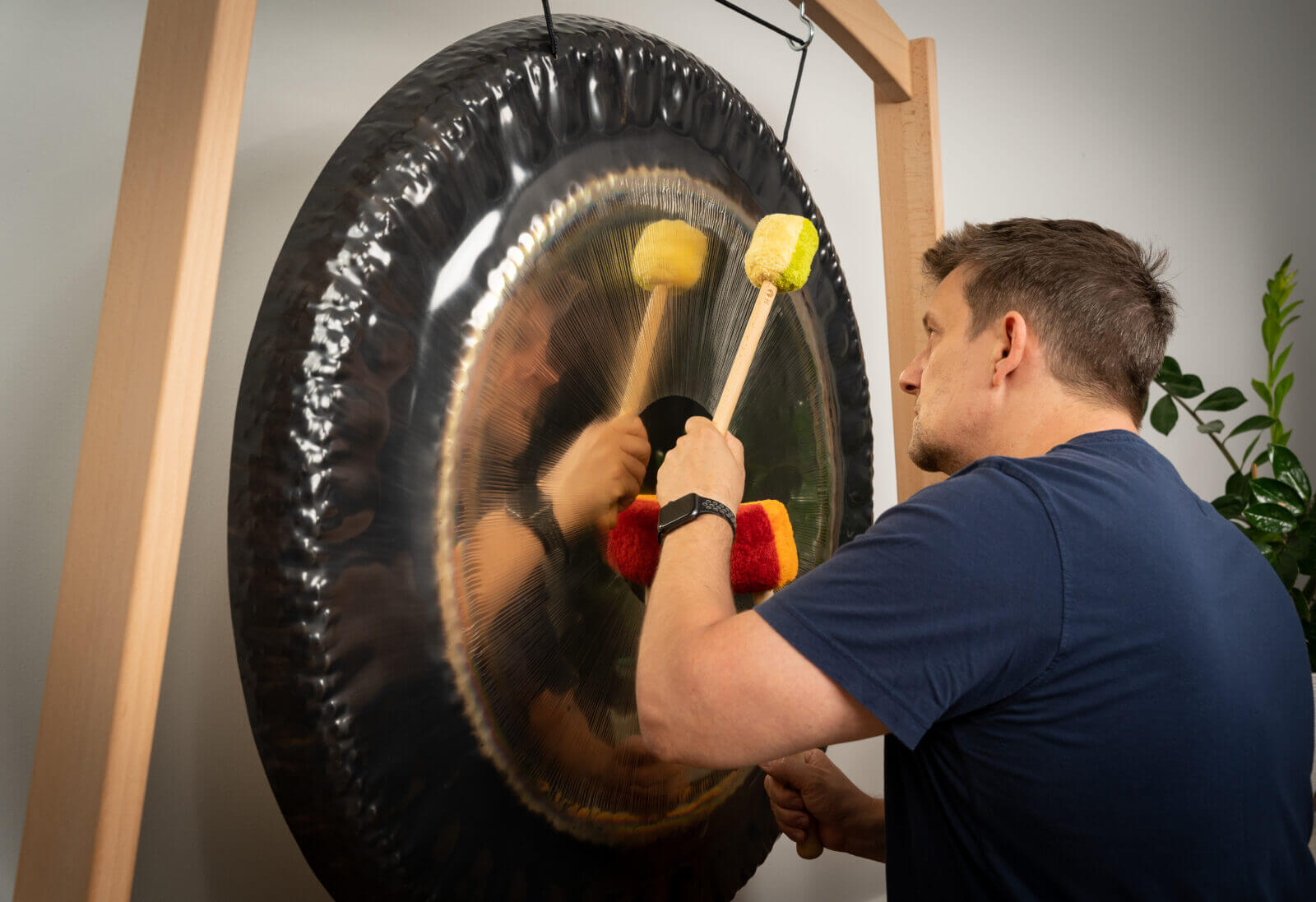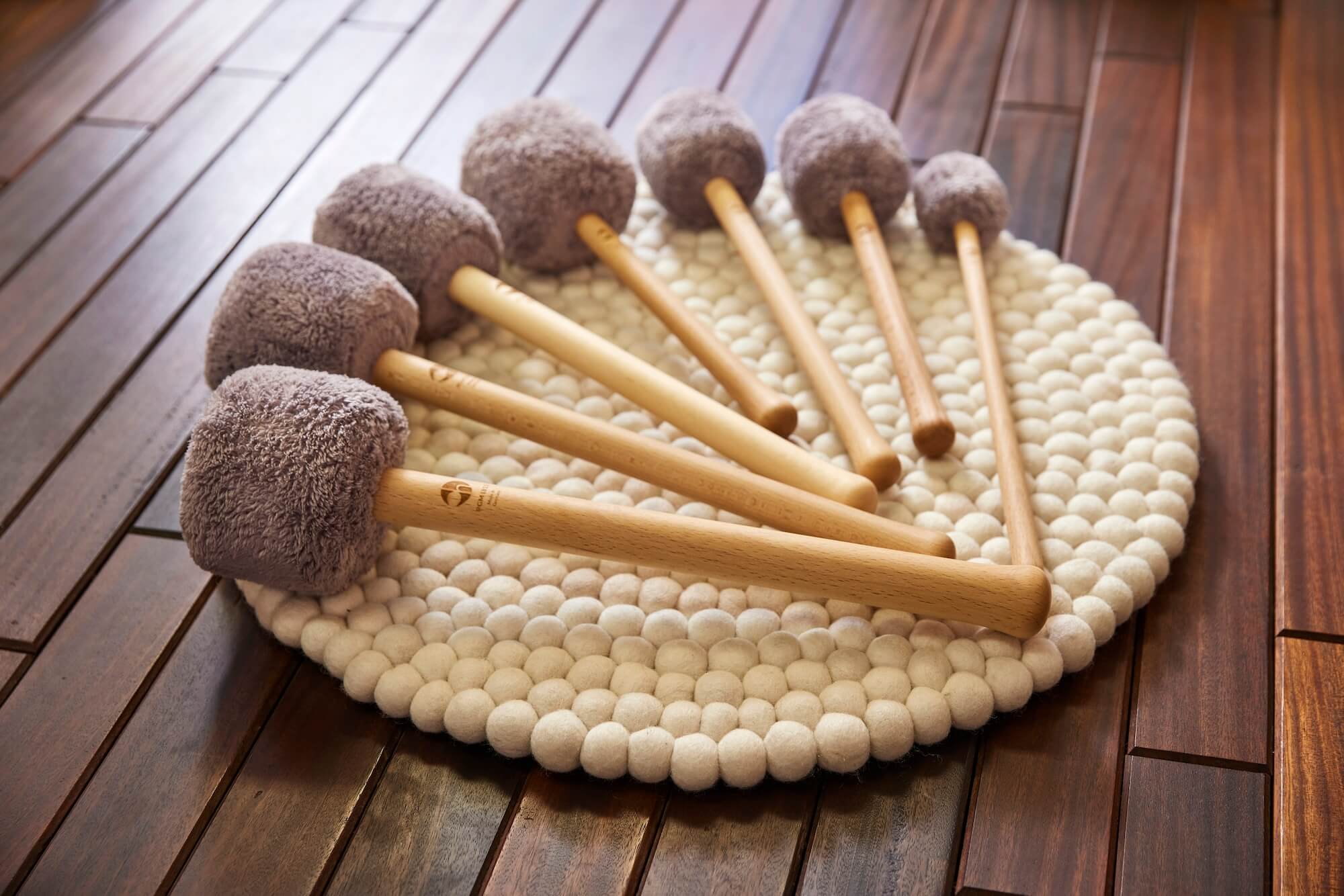 During the Peter Hess sound massage, Olli discovered his enthusiasm for gongs - and the desire to develop sound tools. When Olli realized that conventional mallets did not fully bring out the sound, he began to experiment. With a lathe, countless tests and a lot of patience, he finally found the perfect combination for a mallet: natural caoutchouc as the core, Oekotex wellness fleece as the cover.